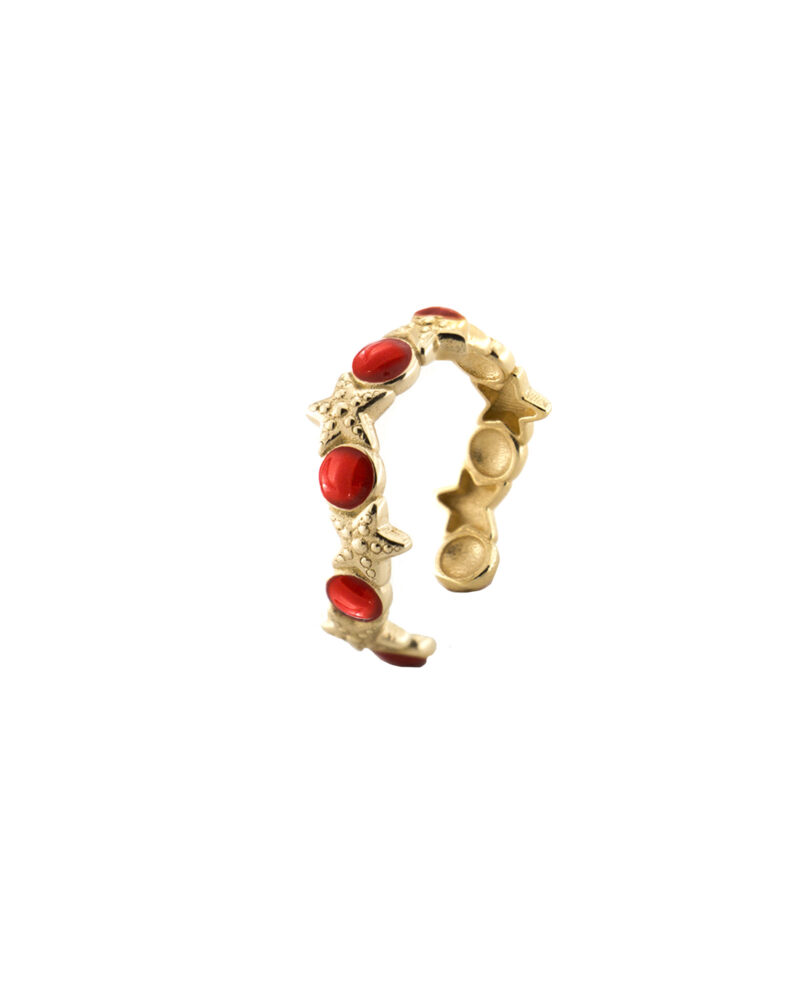 Anello con stelle marine e punto di colore corallo stile cabochon smaltato a mano.