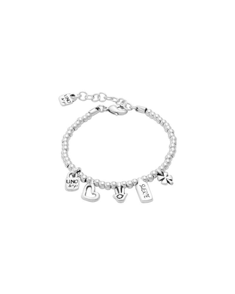 Lucchetto, cuore, mano di fatima, targhetta con inciso Suerte, quadrifoglio.