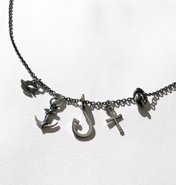 la sua lunghezza è 50cm e al centro pendono cinque ciondoli: