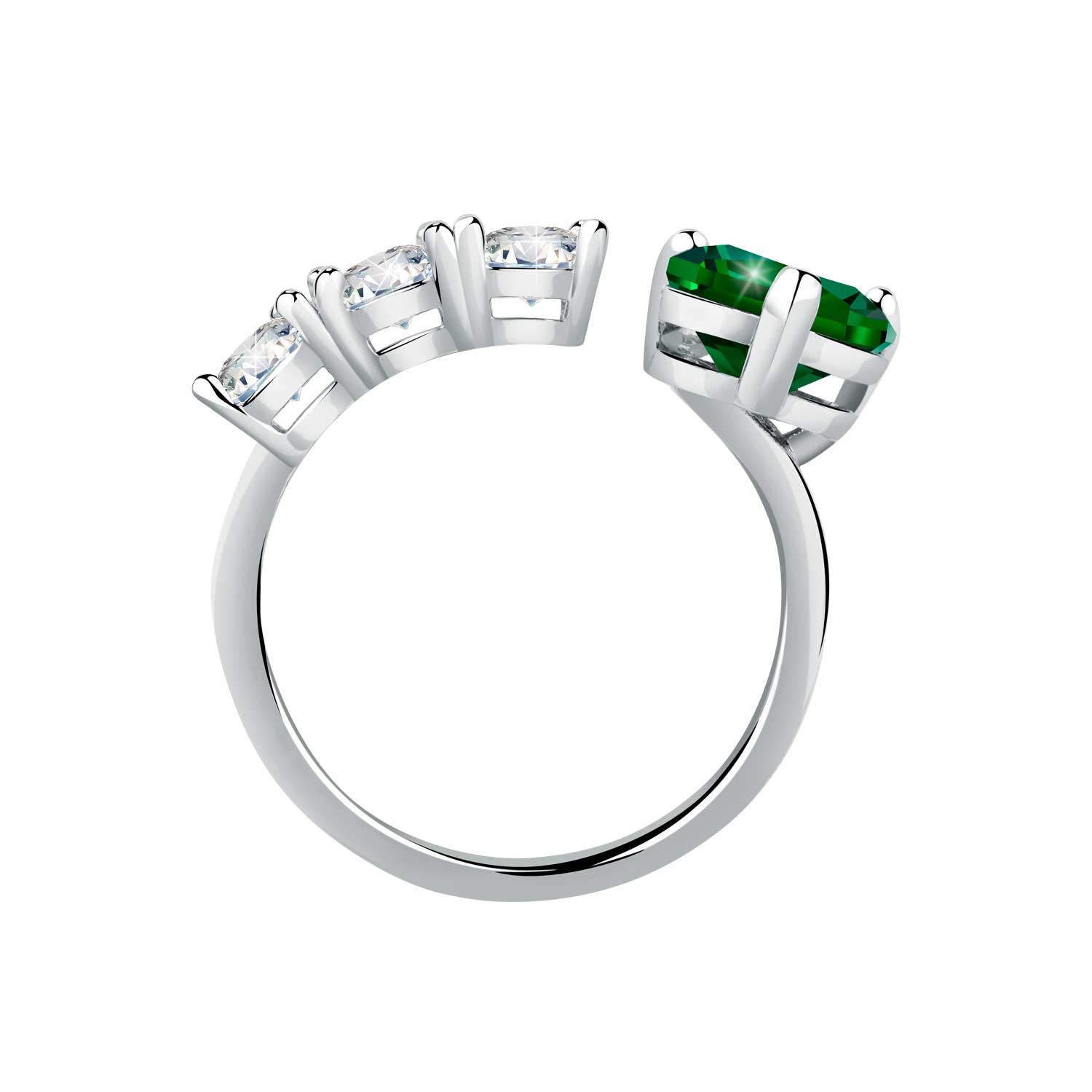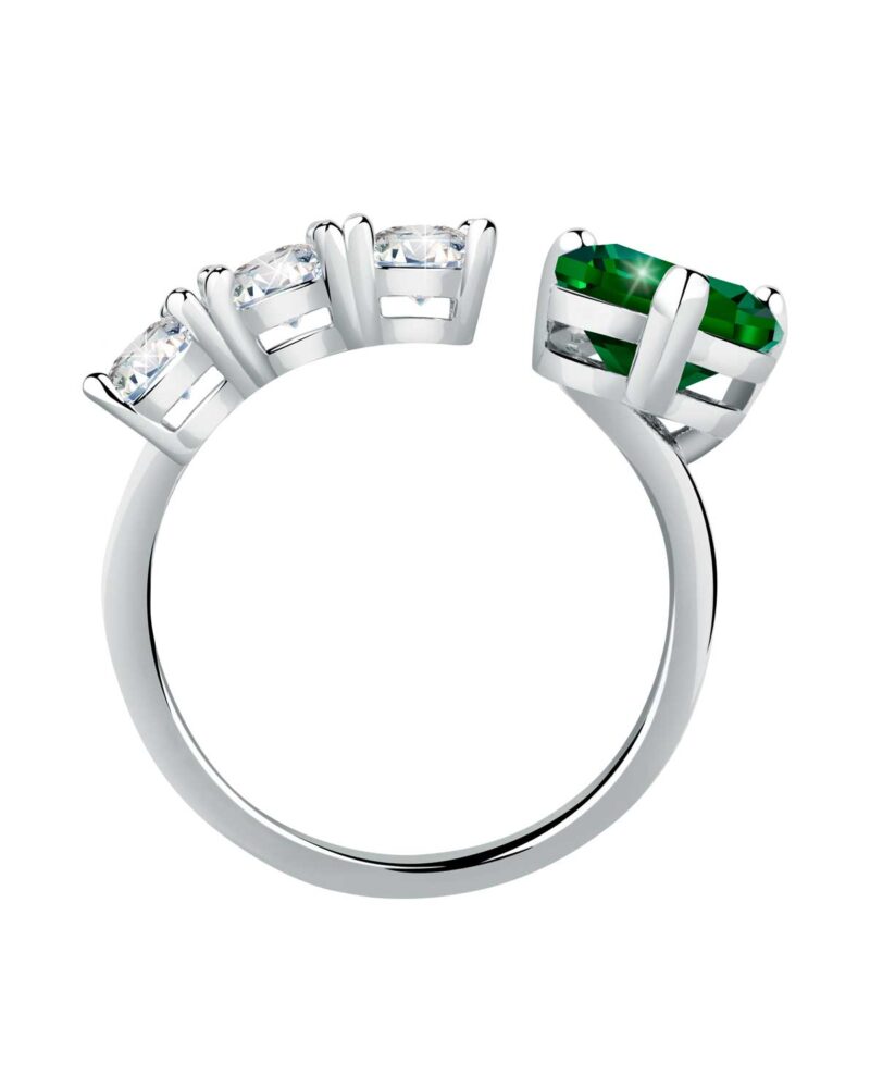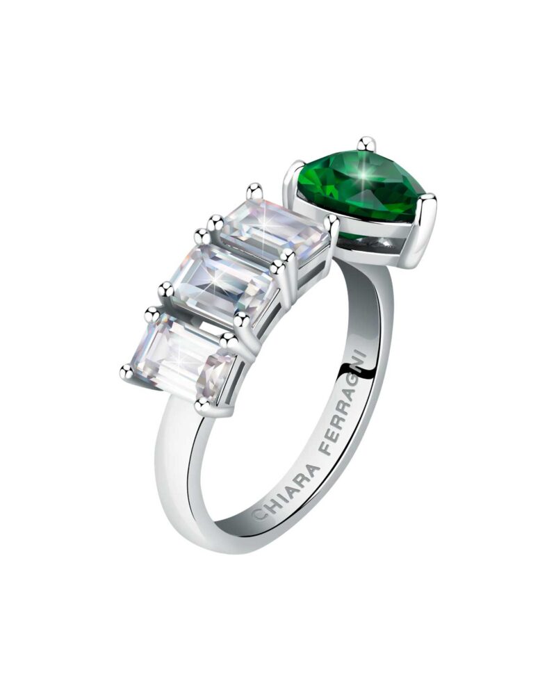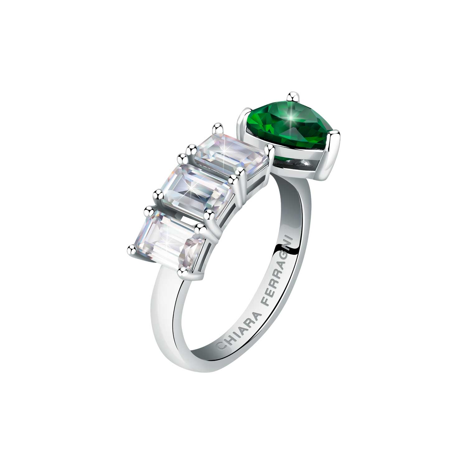 ring with white baguette and emerald heart stone