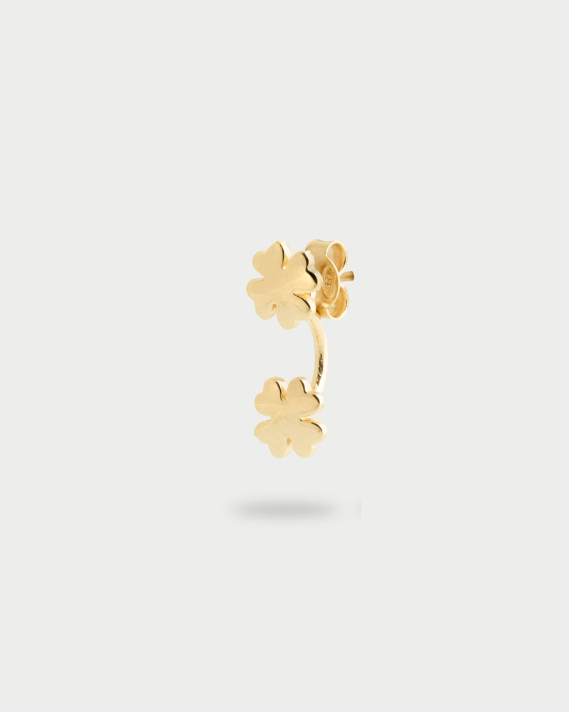 Mono orecchino composto da due quadrifogli: uno posizionato sul lobo e l’altro sotto l’orecchio, collegati da un elegante archetto che si avvolge delicatamente dietro l’orecchio.